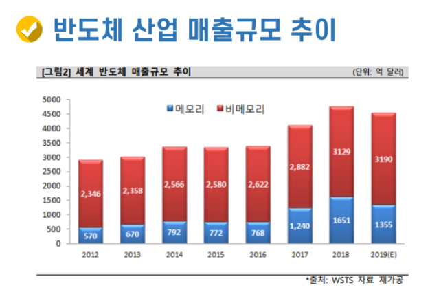 수출로 먹고사는 우리나라에서 반도체는 수출에서 가장 큰 비중(19%)을 차지하고 있으며 지금까지 이루어온 경제성장에 기둥 역할을 해왔는데 최근 글로벌 침체로 인해 수출부진, 가격하락등으로 인해 위기를 맞고 있으며 이는 대한민국 경상수지 적자, 경제성장률 하락이라는 결과를 보여주고 있다. 우리나라의 경제의 비중에 반도체 비중이 너무 높다 보니 반도체의 분위기에 따라 대한민국 경제가 같이 영향을 받고 있는 상황이다.