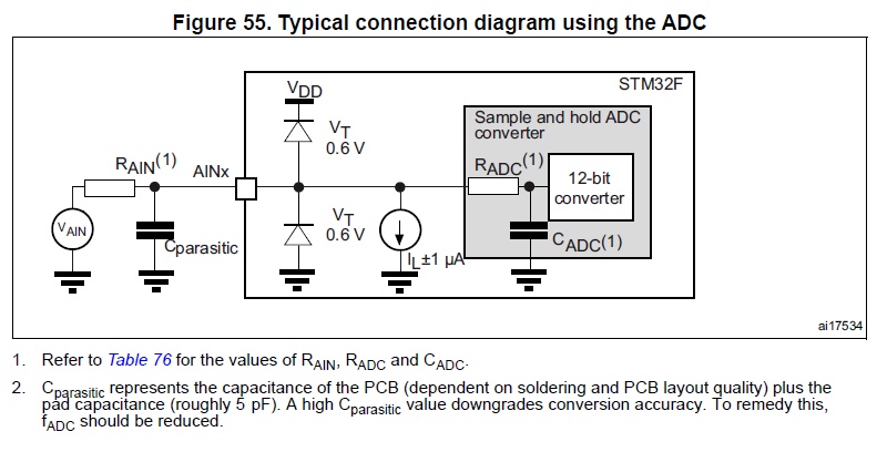 ADC의 경우 외부에서 입력되는 신호의 임피던스 조절 및 노이즈를 줄여주기 위해 아래와 같이 저항과 커패시터를 이용해 부가회로를 추가로 구현하면 ADC 정확도를 높일 수 있다.